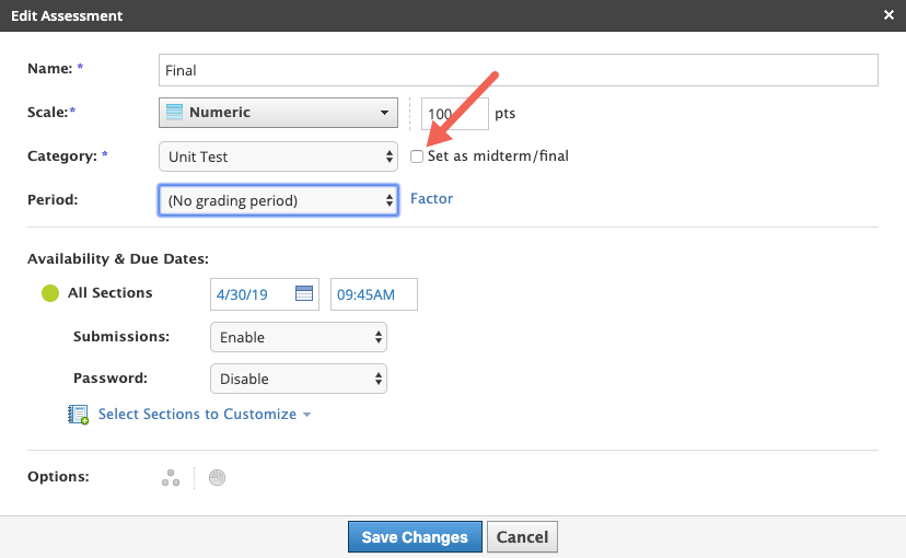 يمكنك تعيين أي اختبار/امتحان أو واجب أو تقييم أو مناقشة يتم إضافة درجات عليها كاختبار منتصف العام أو نهائي في Schoology. يؤثر تعيين عنصر كعنصر في اختبار منتصف العام أو اختبار نهائي في كيفية ظهور العنصر في دفتر الدرجات وكيفية حساب درجته في المقرر.