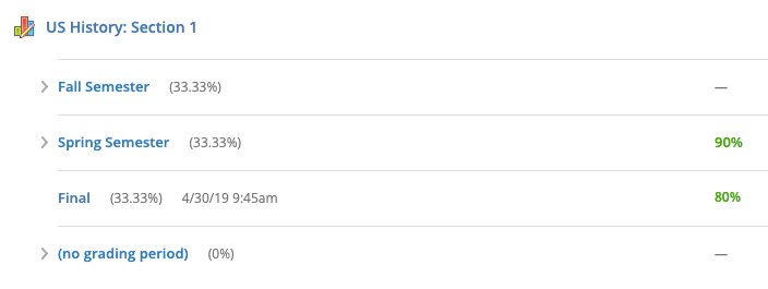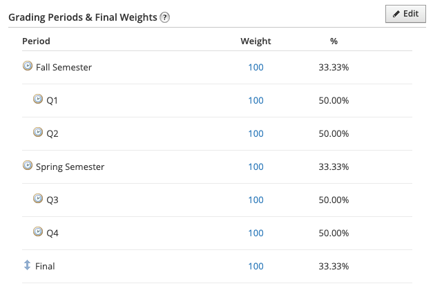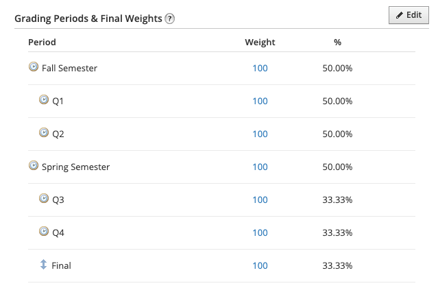 يمكنك عرض كيفية حساب اختبار منتصف العام أو اختبار نهائي في إعداد التقدير الخاص بالمقرر ضمن فترات التقدير والترجيحات النهائية. من إعداد التقدير، يمكنك ضبط ترجيح اختبار منتصف العام أو اختبار نهائي تمامًا كما تفعل مع فترة التقدير أو الفترة الفرعية. ويمكنك استخدام رمز السهم المزدوج لسحب العنصر وتحريكه. يمكن أن يؤدي نقل العنصر إلى تغيير فترات التقدير التي ترجح خلالها اختبار منتصف العام أو اختبارًا نهائيًّا.
