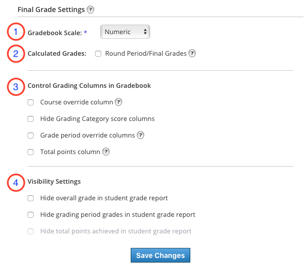 استخدم "إعدادات الدرجات النهائية" ضمن "إعداد الدرجات" لتخصيص كيفية حساب الدرجات النهائية وعرضها للطلاب وأولياء أمورهم. وتوضِّح هذه المقالة إعدادات الخيارات المتنوعة التي يمكنك تكوينها بصفتك مسؤول المقرر.
