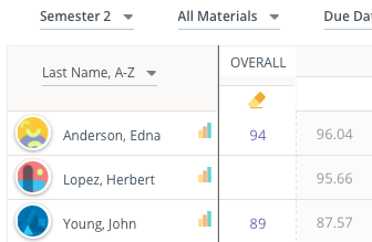 يضيف عمود تجاوز المقرر عمودًا إضافيًا فارغًا للدرجة الإجمالية إلى دفتر الدرجات الخاص بك، والذي يمكنك من خلاله إدخال الدرجة الإجمالية لطلابك يدويًا. ويتم عرض عمود التجاوز على يسار عمود الدرجات المحتسبة، وتتم الإشارة إليه من خلال أيقونة ممحاة القلم الرصاص الصفراء. ولا يرى الطلاب سوى النتيجة التي أدخلتها في هذا العمود، وليست الدرجات المحتسبة الخاصة بهم. ويُعد إدخال درجة التجاوز أمرًا اختياريًا؛ حيث يتم عرض الدرجة الإجمالية المحتسبة عندما لا تقوم بإدخال تجاوز.