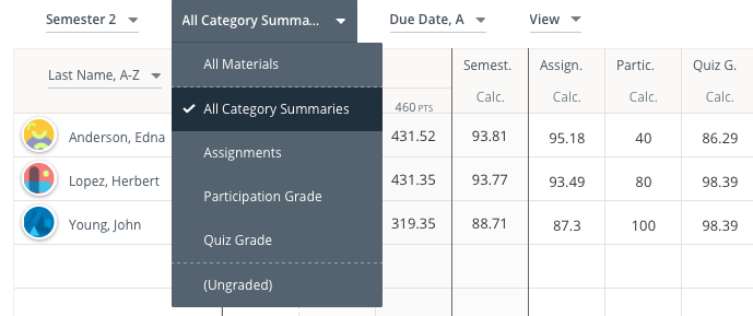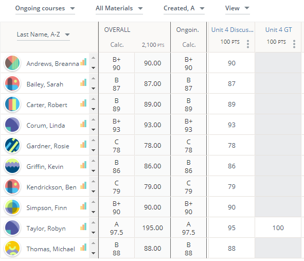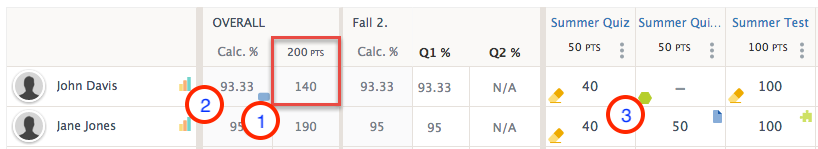 يضيف عمود إجمالي النقاط عمودًا يعرض إجمالي النقاط التي حصل عليها كل طالب خلال فترة وضع العلامات بأكملها. ويتم عرض إجمالي النقاط المحتملة للمقرر في رأس العمود. ويعرض عمود مجموع النقاط على يمين عمود الدرجات المحتسبة. ويكون هذا الخيار مفيدًا للمقررات التي تستخدم مجموع النقاط بدلًا من مقياس التصحيح التقليدي، على سبيل المثال، أو أي فصل دراسي أو مقرر دراسي ترفيهي كذلك.