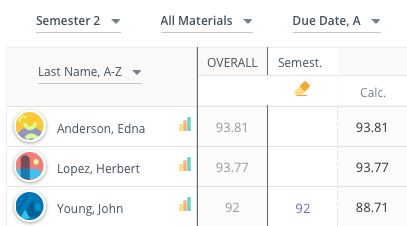 استنادًا إلى بيانات الدرجات الموجودة في لقطة الشاشة أعلاه، سيتم عرض درجة فترة تصحيح الطالب "جون" (John) للفصل الدراسي الثاني بنسبة 92 بالمائة في تقرير الطالب الخاص به. إضافة إلى ذلك، يتم الآن استخدام هذه الدرجة بدلًا من درجته المحتسبة في الفصل الدراسي الثاني لاحتساب درجته الإجمالية في المقرر. ونظرًا إلى أن المعلم لم يُدخل الدرجات في أي من أعمدة التجاوز الخاصة بالطالبة "إدنا" أو الطالب "هيربريت"، فسوف تُعرض الدرجات في العمود المحتسب في تقارير درجات الطلاب الخاصة بهم.