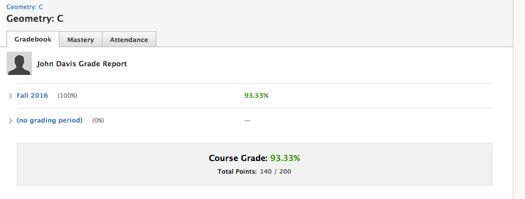- وفي هذا المثال ، يبدو أن الطالب "جون ديفيز" (John Davis) قد حصل على 140 من أصل 200 نقطة ممكنة بما يساوي 70 بالمائة.