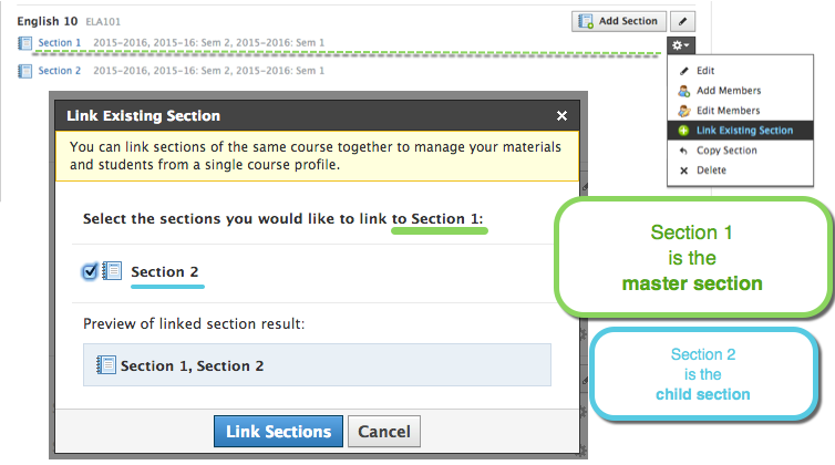 - يجب أن تكون الأقسام داخل نفس المقرر الدراسي ومن ثم تشترك في نفس رمز المقرر الدراسي