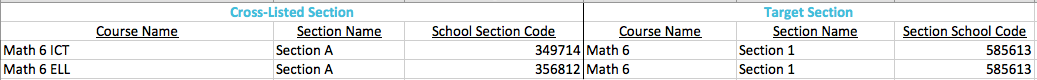 الشعبة المدرجة في القائمة المشتركة: الشعبة التي سيتم إدماجها في الشعبة المستهدفة. لن يرى معلم المقرر والطلاب المقرر المرتبط بهذه الشعبة عند تسجيل الدخول إلى Schoology، ستظهر فقط كشعبة مستهدفة. إذا قمت باستيراد ملف القائمة المشتركة بعد إنشاء المواد وإعطاء الدرجات، فإن جميع المواد والدرجات في الشعبة المدرجة في القائمة المشتركة لن يتم الاحتفاظ بها. ومع ذلك، إذا كانت مدرستك تستخدم SIS مع الإرجاع التلقائي للدرجات، فسيتم إرجاع الدرجات مرة أخرى إلى الشُّعَب المنفصلة في نظام معلومات الطالب (SIS) الخاص بك.