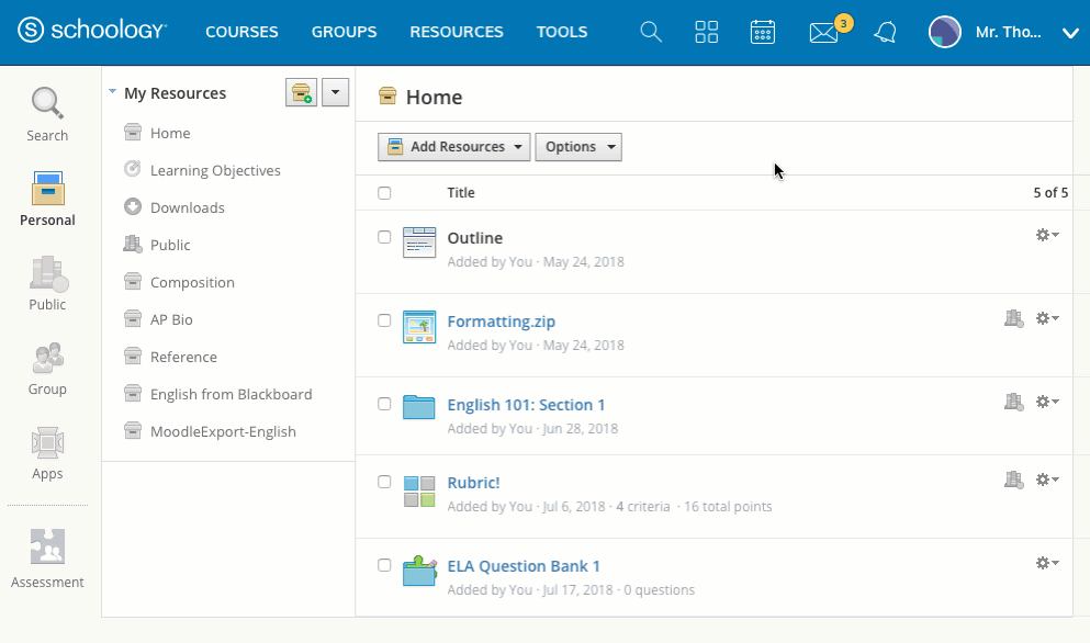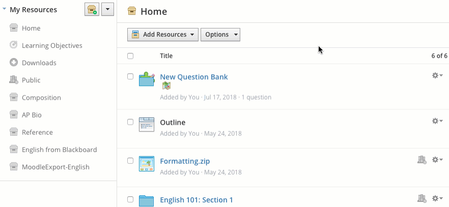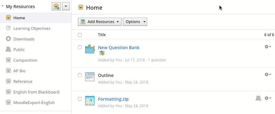 - تنفصل بنوك الأسئلة عن بنوك العناصر لتقييم المقررات في المصادر الشخصية ومصادر المجموعة الخاصة بك.