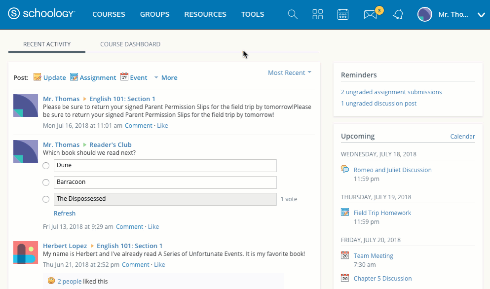 - انقر فوق المقررات أعلى القائمة، وحدِّد مقررًا ذا امتحانات/اختبارات.