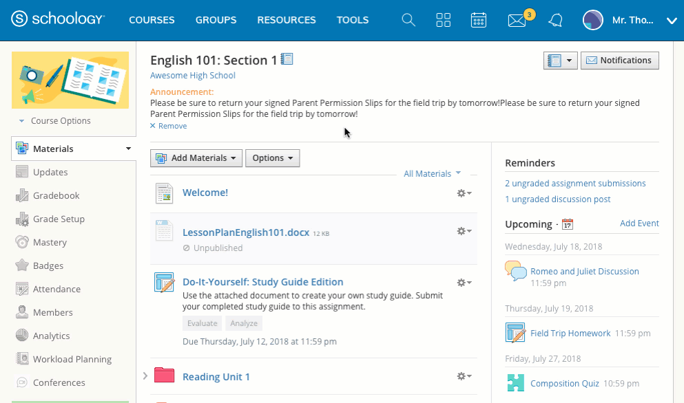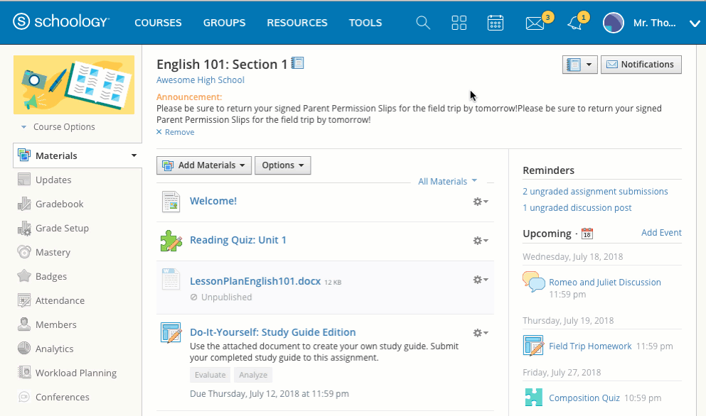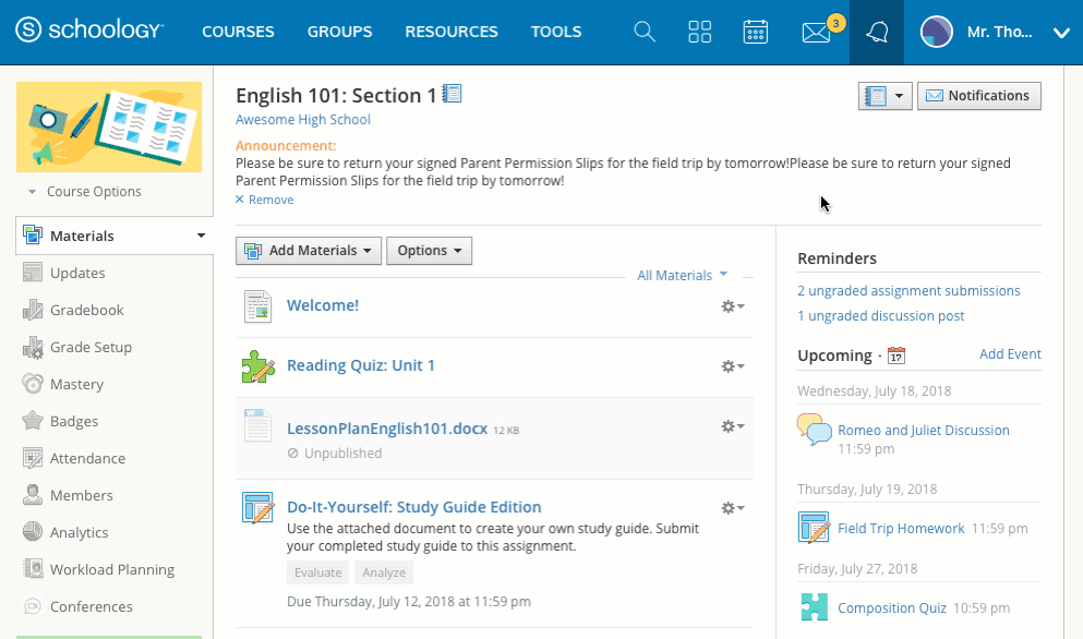 لا يتوفر خيار إنشاء الامتحان/الاختبار على إصدار Schoology Basic.