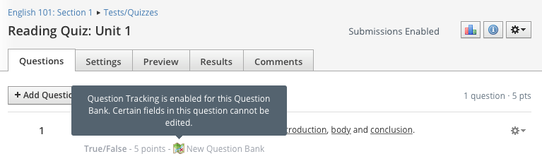 - عندما يكون هنام سؤال واحد على الأقل قيد الاستخدام في بنك الأسئلة مع تمكين ميزة تمكين تتبع السؤال، فإنك سترى أيقونة تشير إلى أنه تم قفل هذا السؤال الآن. عندما يكون بنك الأسئلة مغلقًا، لا يمكن تعطيل ميزة تمكين تتبع السؤال.