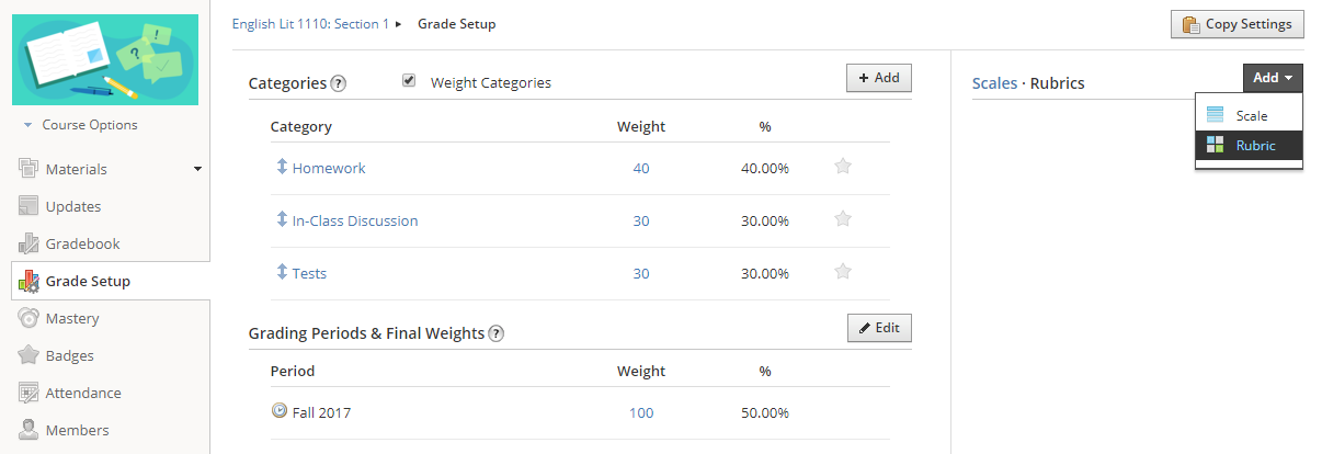 حدِّدإعداد الدرجات في القائمة الموجودة يسارًا في صفحة المقرر.