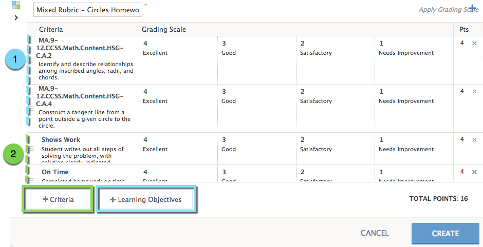 يمثل أول صفين في عمودالمعاييرمعايير تتوافق مع المقاييس. انقر فوق +أهداف تعليميةلإضافة معايير تتوافق مع المقاييس إلى قاعدة التصحيح، ثم تتبَّع التقدم الذي أحرزه طلابك في هذه المعايير في قسم الإتقان.
