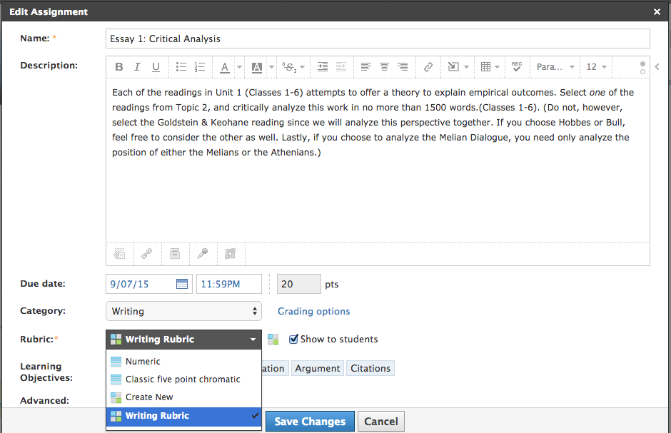 عند إضافة قاعدة تصحيح إلى عنصر تم تصحيحه، سترى خيارإظهار للطلابأثناء عملية التعديل أو الإنشاء. قم بتمكين مربع الاختيار هذا للسماح لأعضاء المقرر بالاطِّلاع على قاعدة التصحيح في ملف تعريف الواجب أو المناقشة.