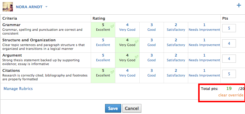 لتغيير النتيجة الإجمالية في قاعدة التصحيح، انقر فوق خليةإجمالي النقاط، وأضف نتيجة جديدة. وبعد تغيير النتيجة، سيظهر رابطإزالة الإضافةأسفل النتيجة — انقر فوق هذا الرابط لإعادة النتيجة مرة أخرى إلى إجمالي درجات المعايير الفردية.