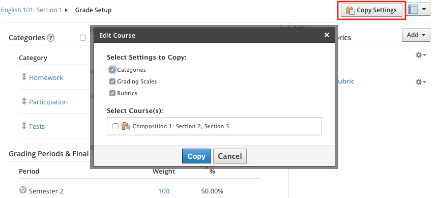 فيقالب إعداد الدرجات،انقر فوق نسخ الإعداداتفي أعلى يمين الصفحة.