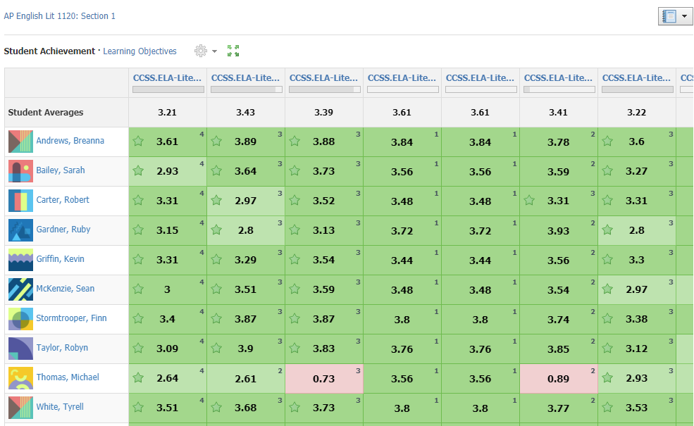 - Mastery Score (درجة الإتقان) في Objective A (الهدف أ) بعد الملاحظة الثالثة: (1.25 * 25%) + ( 3 * 75%) = 2.56