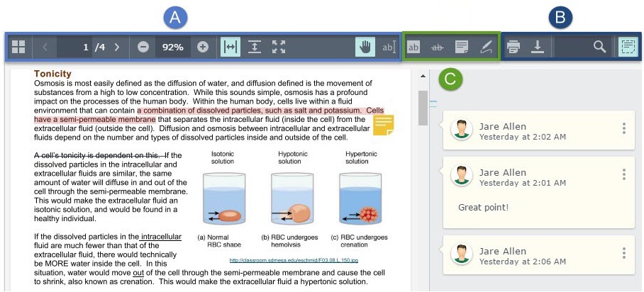 تتكون ثلاث شُعب من شريط القوائم على طول الجزء العلوي من عارض المستندات: تتوفر الشعبتان A وB لجميع المستخدمين، بينما تتوفر الشعبة C فقط للمعلمين الذين يقومون بتصحيح واجبات الطلاب والتعليق عليها.