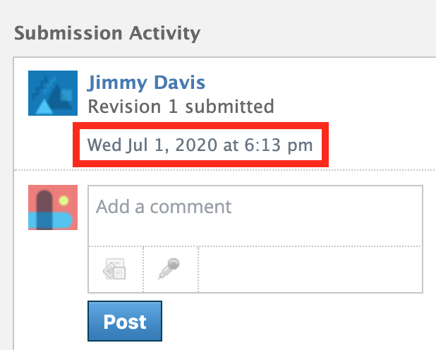 يمكن للمعلمين أو الطلاب إضافة ملاحظات أو تعليقات أو أسئلة تتعلق بالواجب نفسه في منطقةSubmission Activity (نشاط الإرسال)على يمين لوحة المراجعات. يمكنك أيضًا إرفاق ملفات أو تسجيلات صوتية بهذه التعليقات.
