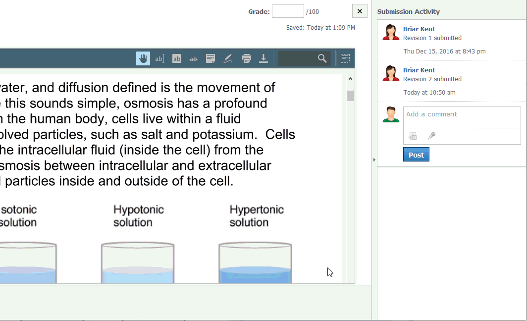 ترسل التعليقات التي تمت إضافتها إلى منطقةSubmission Activity (نشاط الإرسال) إشعارًا إلى الطالب والمعلم. الملاحظات المضافة إلى المستند نفسه باستخدام أيقونةNotesلا ترسل إشعارًا.