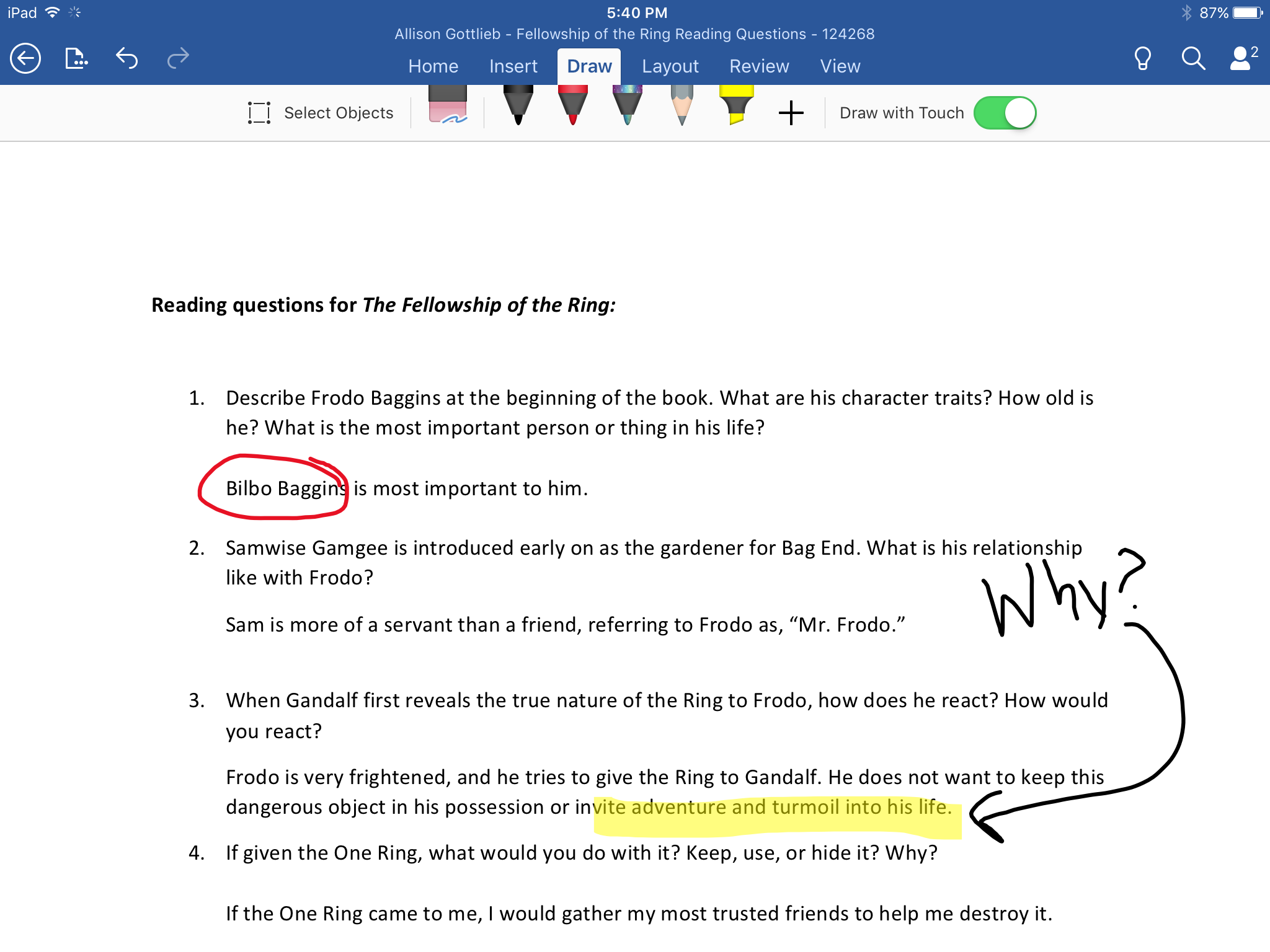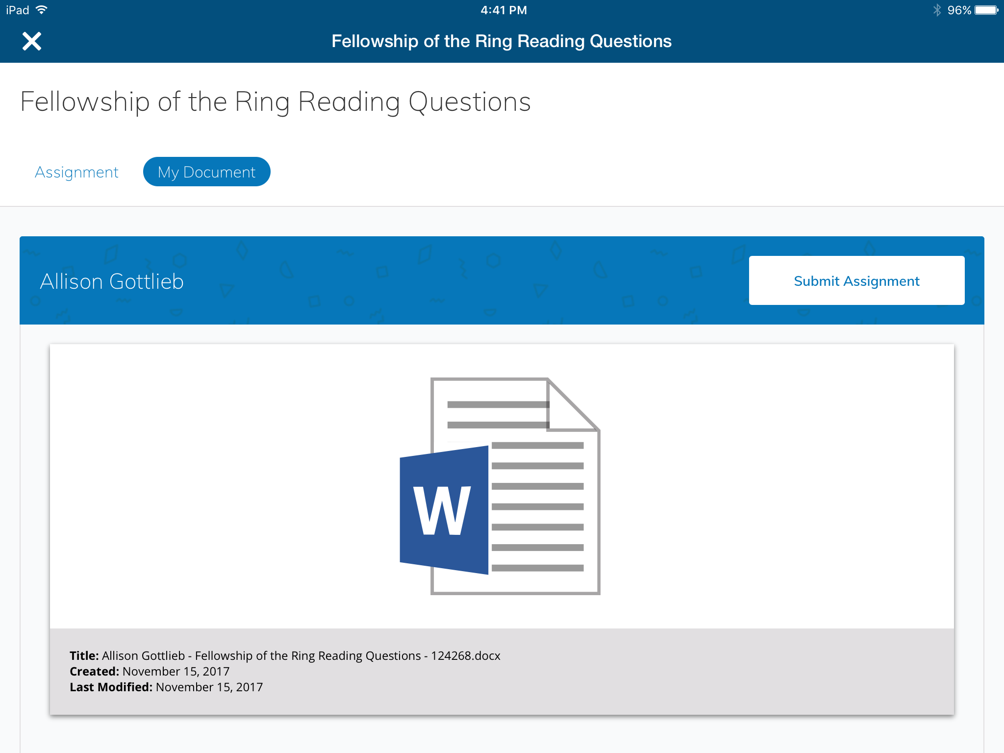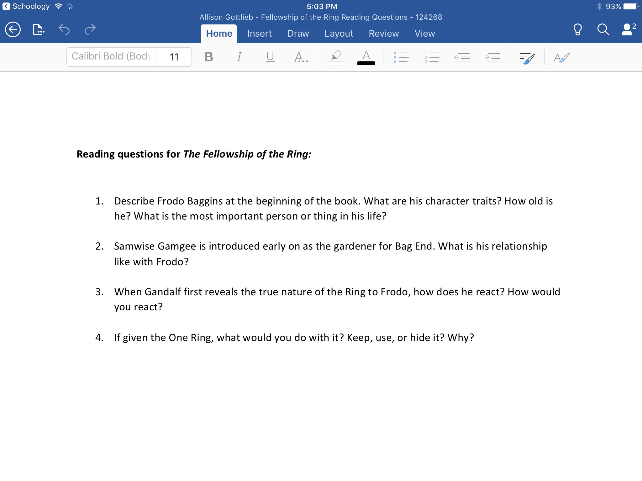 سيتم تشغيل الملف في تطبيق Word، حيث يمكنك عرض نسختك من ملف الواجب وتعديلها. عند الإكمال من العمل وحفظ عملك في Word، اضغط على Schoology في الزاوية العلوية اليسرى من الشاشة للعودة إلى تطبيق Schoology.
