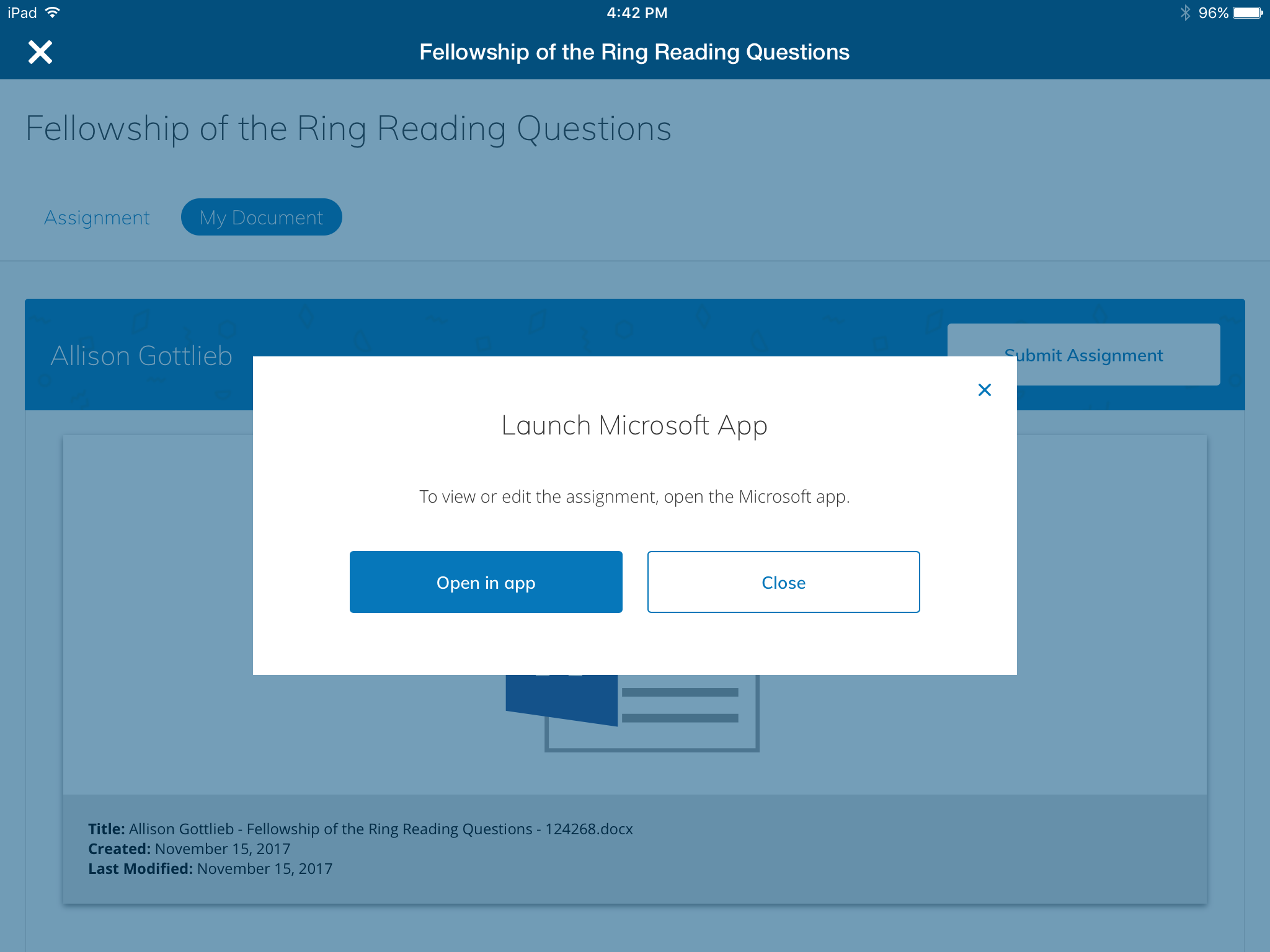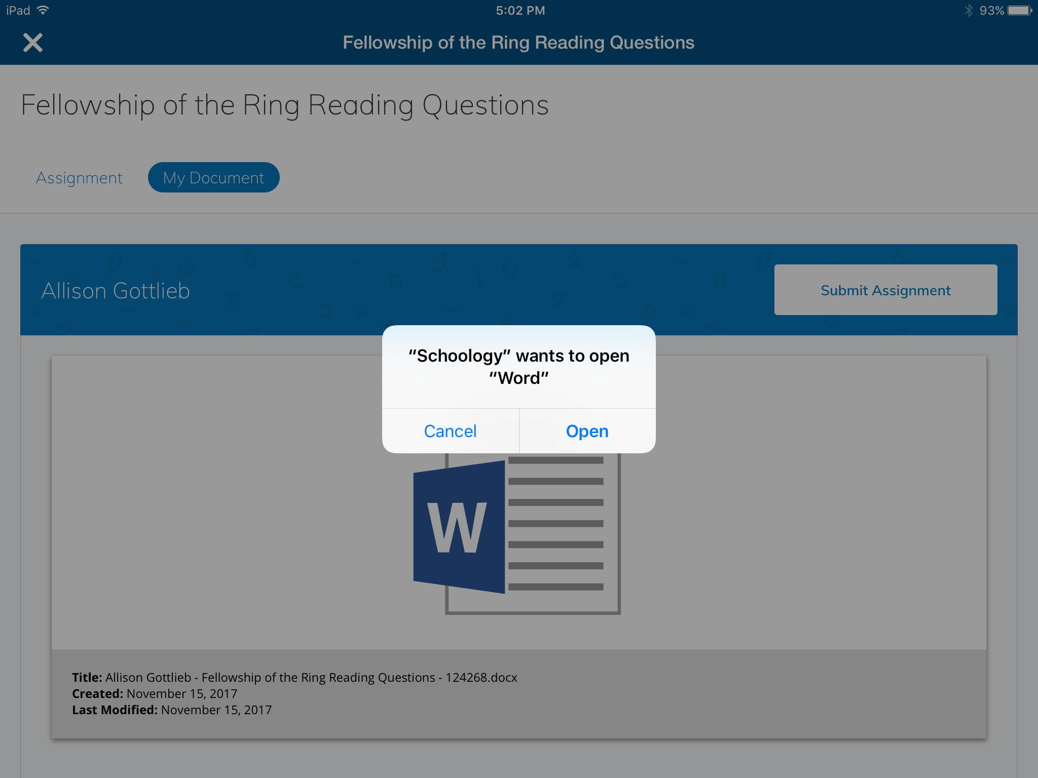 يؤدي هذا إلى تشغيل الملف في تطبيق Microsoft المعني. في المثال التالي، يحتوي الواجب على ملف .docx، اضغط على فتح لتشغيل تطبيق Word على كمبيوتر لوحي: