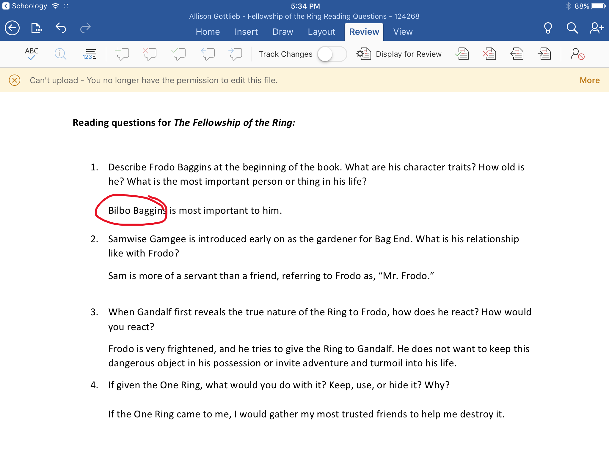 عند العودة إلى في تطبيق Schoology، اضغط على إرسال لإرسال ملف Word إلى المحاضر. بمجرد الإرسال، لن يكون لديك إمكانية الوصول لتعديل الملف. إذا انتقلت مرة أخرى إلى تطبيق Word لتعديل الملف، فستظهر رسالة تحذير: